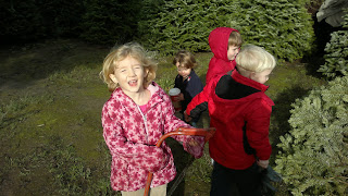 | Since Alison and I were dragging the trees, the children kindly hauled everything else, like saws and empty latte cups. |